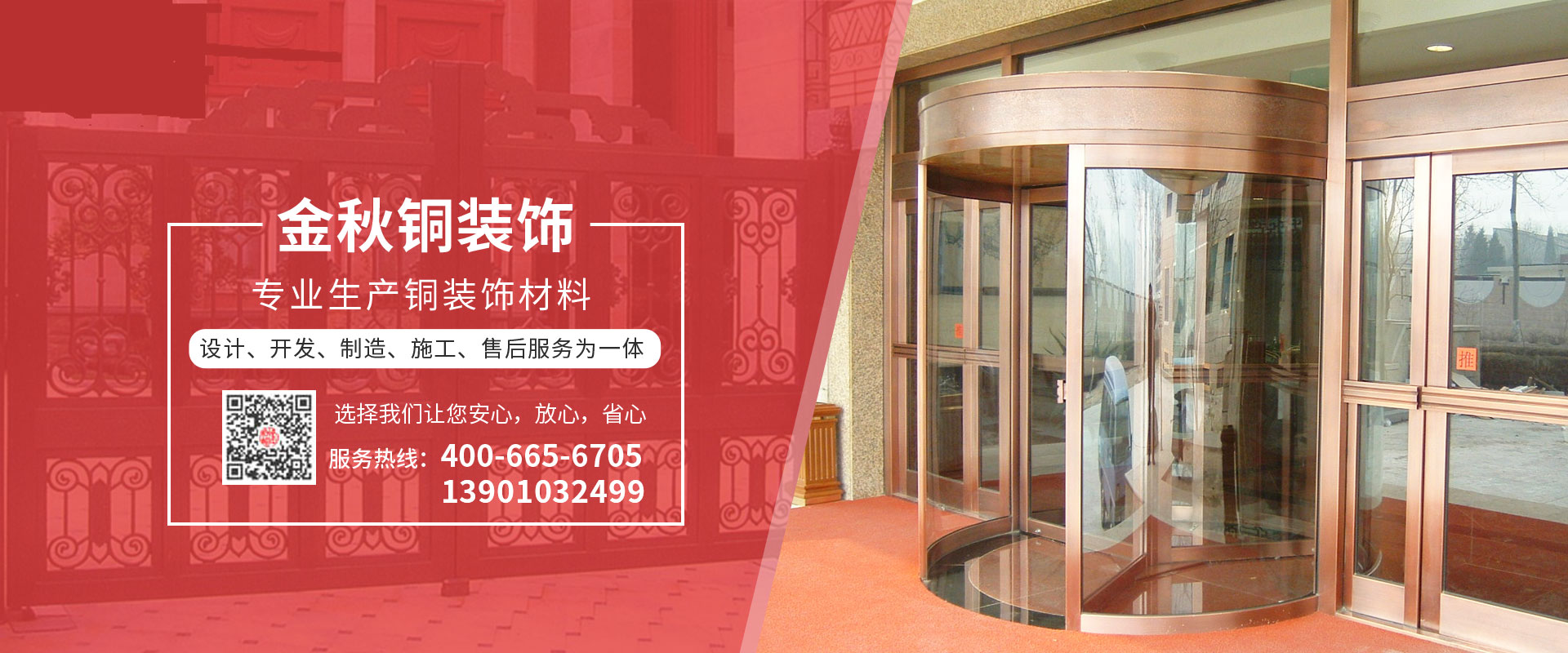 北京金秋銅裝飾材料有限公司是專業(yè)生產銅裝飾材料及設計、開發(fā)、制造、施工、售后服務為一體的大型綜合企業(yè)。可承接建筑銅裝飾工程及五星級酒店、別墅、博物館、樓樘管所等高檔銅裝飾項目;生產各種規(guī)格的旋轉門、平滑門、別墅門、電控門、工藝門、旋轉護欄、屋頂銅飾防水瓦、浮雕壁畫......